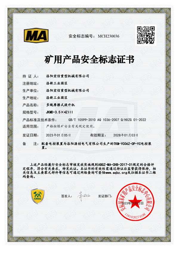 礦用產(chǎn)品安全標(biāo)志證書(shū)MA JKMD-2×4ZI